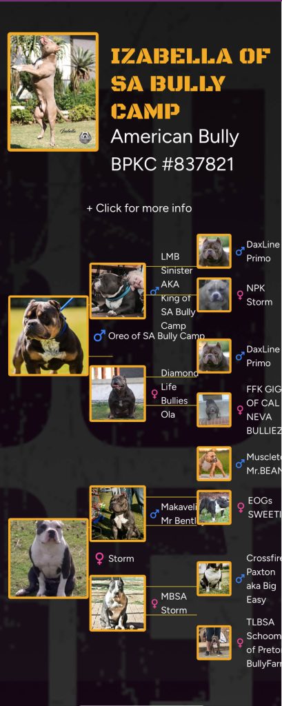 Muscletone’s Veyron was imported from Bashar Daoud and Michael Costea from the world famous camp Muscletone’s Bullies in 2019 and is prospectively the most expensive dog ever imported into South Africa. Bashar and Michael are both exceptional businessmen and it’s been an absolute pleasure working with them from start to finish. Veyron descends from Grand Sire ABKC Champion Mr Magoo and Sire ABKC Champion Mr Bean, who reportedly sold for USD1 000 000 and USD500 000 respectively. We undertook extensive health testing and vetting to ensure that Veyron was of the quality and pedigree owing to a dog of this cost and calibre. Our good friends Sheryl and Gerard Van’t Hul who have a lifetime’s worth of experience in the dog business flew out to meet Veyron, managing the vetting process for us. Veyron will remain unavailable to the South African public to ensure that the exclusivity of his bloodline remains in our kennels; however puppies will be available for sale and semen is available for export at USD3500.