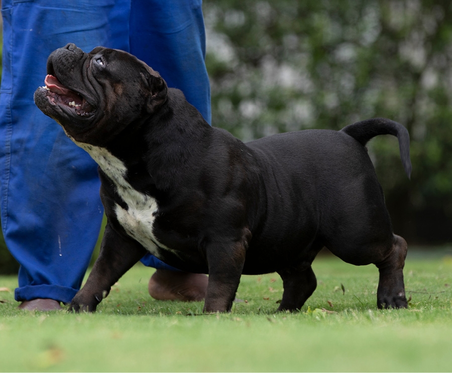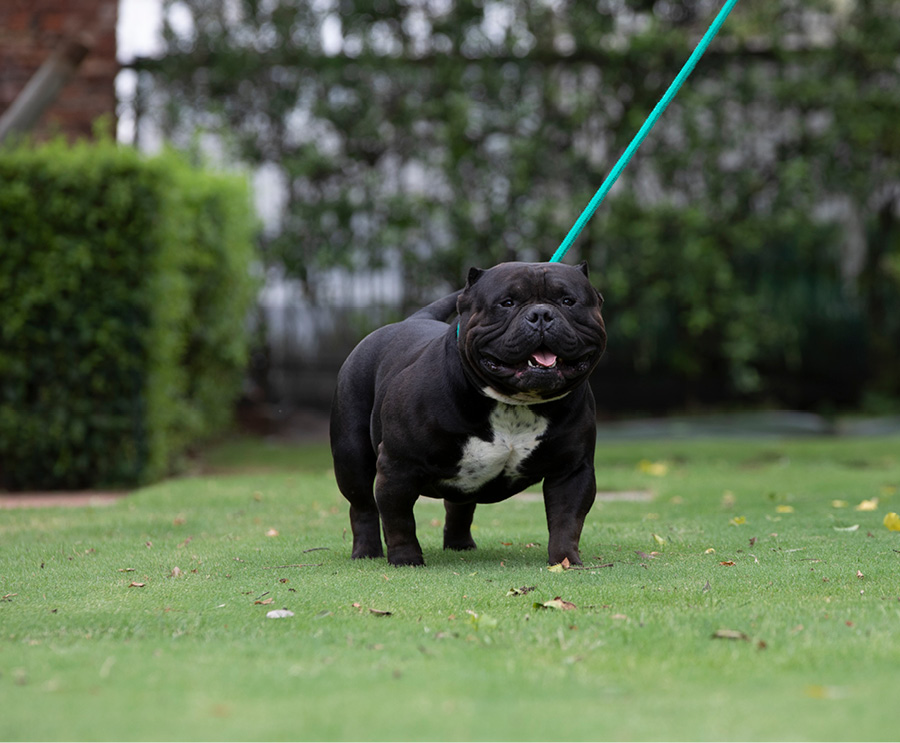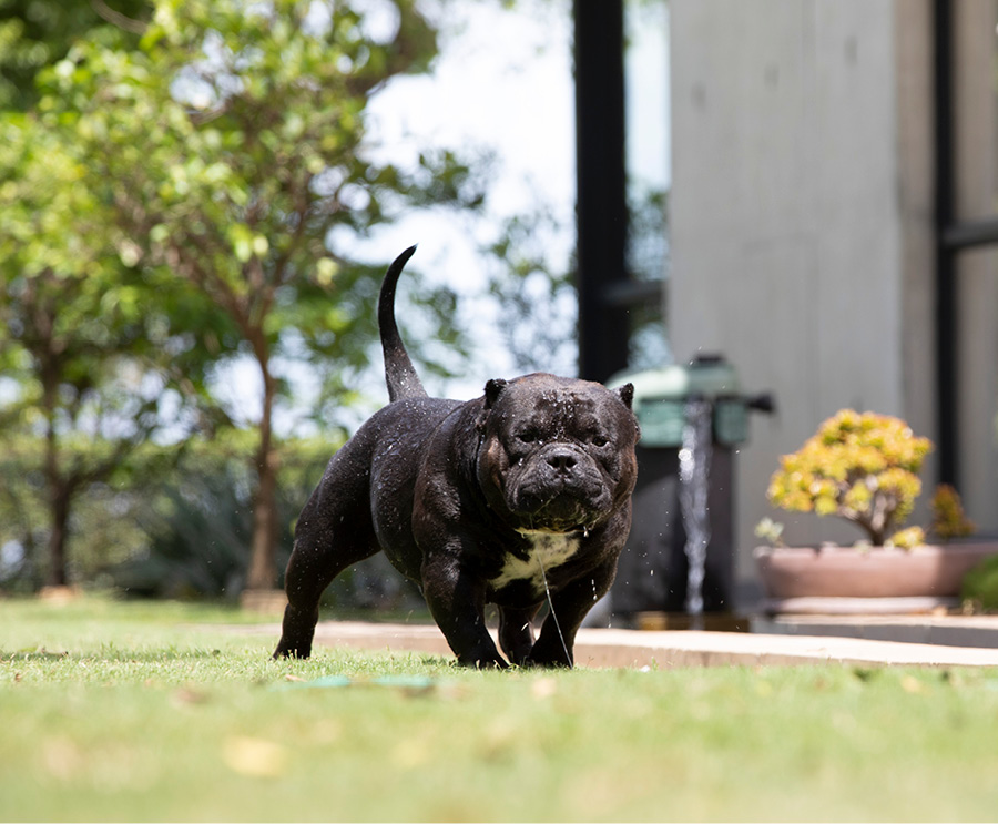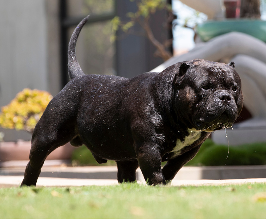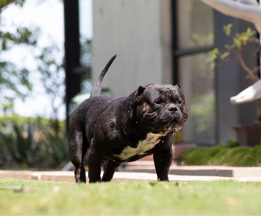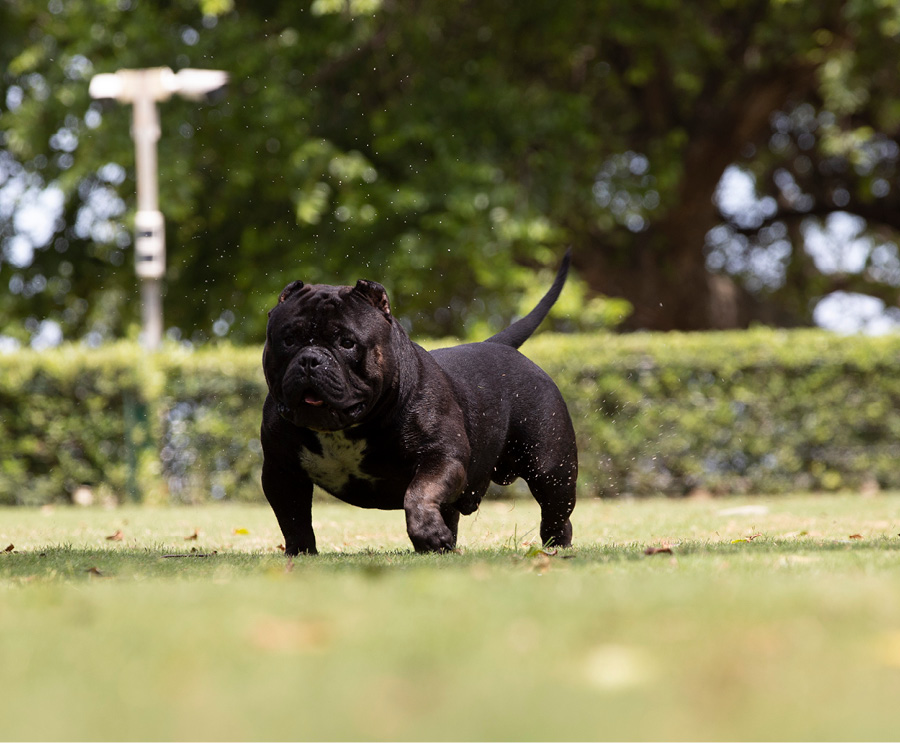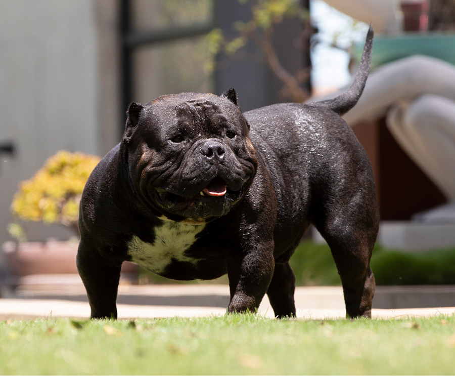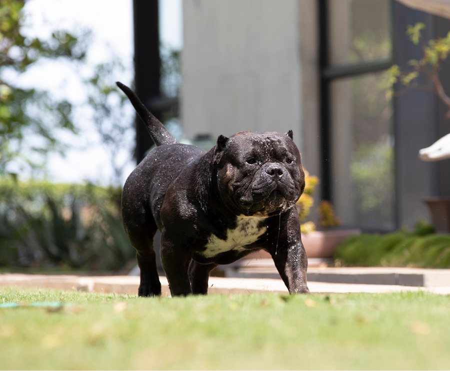 Next Level is our famous extreme Pocket bully, black in colour and super low with a massive chest. We consider him to be the best Pocket American Bully in Africa and one of the finest examples of the breed in the world. Well established & knowledgable dog-men from around the globe have expressed their admiration for Next Level. His extreme build and near perfect dimensions mean his semen is extremely sought after internationally, however he is closed to the South African public to ensure the exclusivity of his bloodlines within our camp.